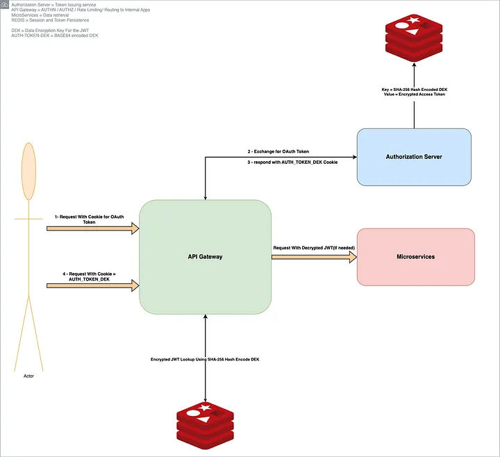 Architecture of the final solution — The user authenticates and receives a JWT, but instead of storing it directly, the Auth server generates a random DEK and uses it to encrypt the JWT. The encrypted token is stored in REDIS (distributed cache) with a key that is a hash of the DEK. The browser is given a small, secure cookie containing the raw DEK (session key). On each request, the API Gateway retrieves the encrypted JWT from REDIS via the DEK’s hash and decrypts it on the fly using the DEK from the cookie. This way, the JWT remains encrypted at rest and never travels in full across the wire or into the browser’s JavaScript context.