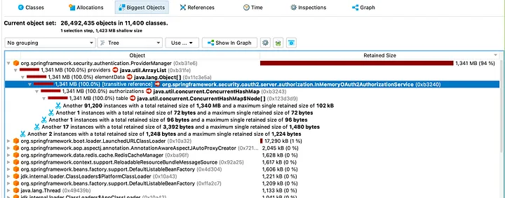 Digging deeper, we found the root cause in the default behavior of Spring Security’s InMemoryOAuth2AuthorizationService. This class stores every token generated by the server in a simple Java ConcurrentHashMap, retaining them in plain text, even after expiration. We hadn’t overridden this behavior in our Spring configuration, and over time, especially during a release freeze (when no fresh containers were being cycled), tokens accumulated unchecked.