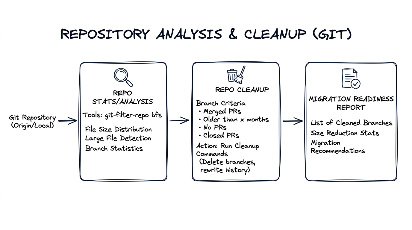 Before migrating anything, we needed to understand what we were working with. Many repositories had been active for years and accumulated binary files committed before LFS existed, oversized blobs buried in history, and stale branches that nobody had cleaned up. Migrating without addressing these would degrade performance in the new platform and complicate every tool in the chain.