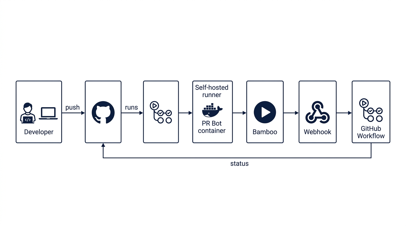 The workflow receives this payload and updates the GitHub commit status for the PR. Build status then appears in the PR UI; developers click "Details" to open the Bamboo job.