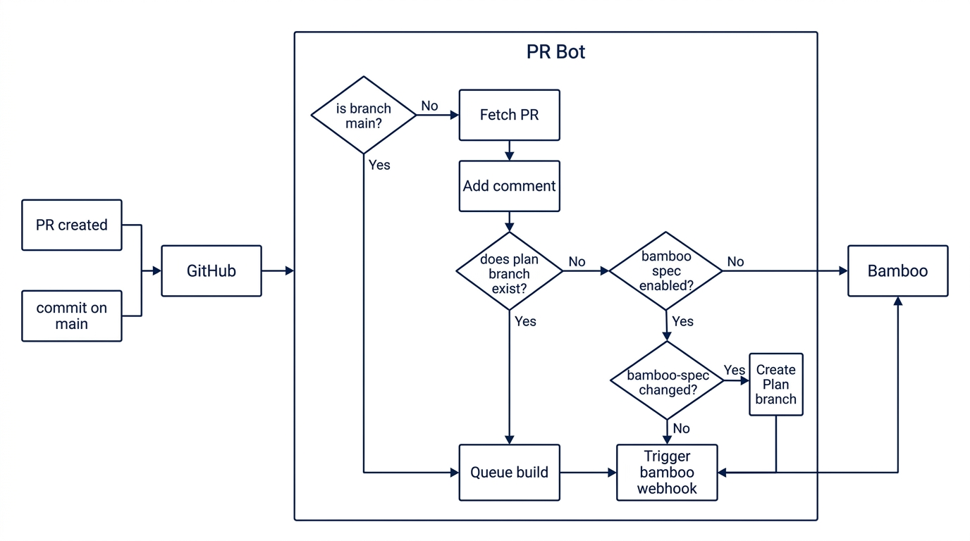 | Sequential builds | Builds run one after the other. Latest build marks PR as InProgress on new commit. Merge checks require Bamboo status on latest commit. Main builds report on the commit that triggered them. |