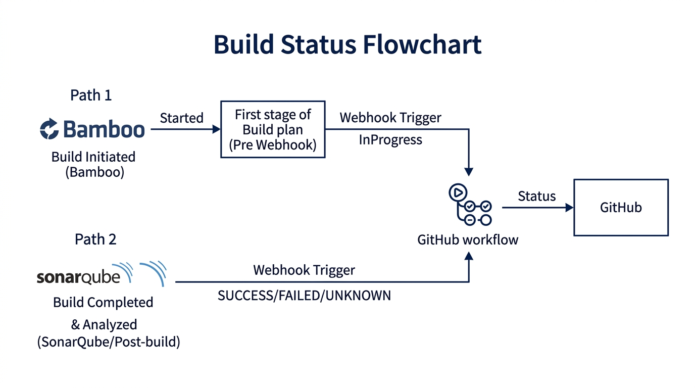 Bamboo reports build status to GitHub via a repository_dispatch webhook: a workflow listens for the event, Bamboo triggers it from PreHook/PostHook, and the workflow updates the PR. Our implementation used a payload like this: